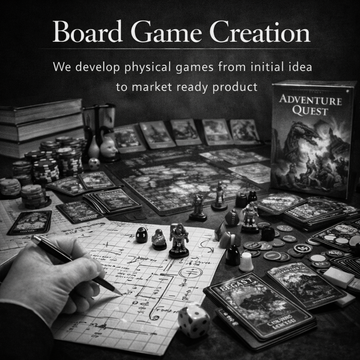 We develop physical games from initial idea to market ready product, including: Game concept development, Rules and gameplay design, Card game creation, Board game development, Packaging design, Prototype development and Manufacturing support.